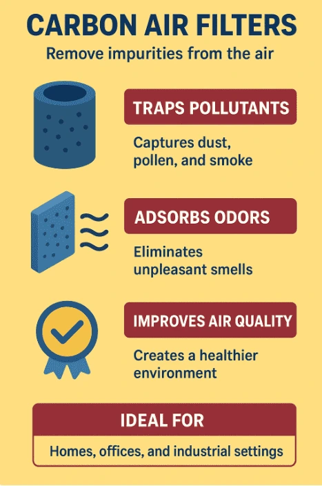 Carbon filters remove odors, VOCs, and chemical pollutants.